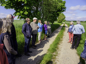 Denne gang ikke en byvandring, men tværtimod en “landvandring”. Fra byskiltene i Borum og nordud til sognegrænsen ved Storkesig Bæk. Det bragte os til gårde på “den nye vang” og mange husmandssteder i et område, der helt frem til midten af 1800-tallet var tomt, ubeboet og træløst. En stor kontrast til i dag.